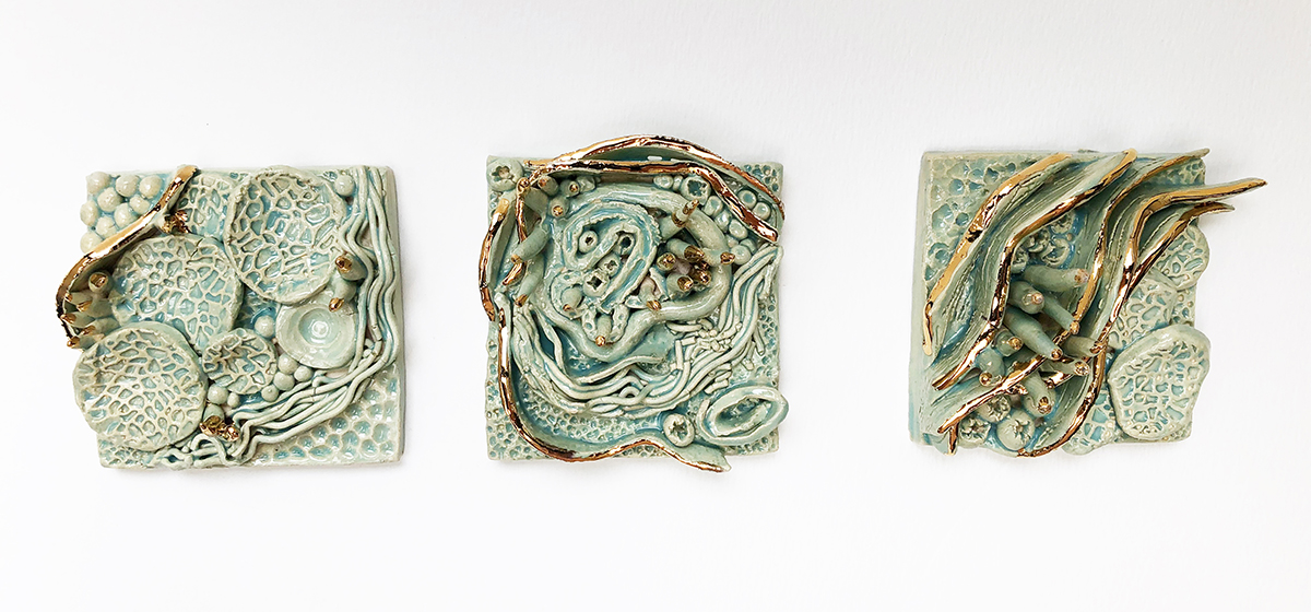 I sculpted these little abstract pieces (3″x3″; 76 cm) intuitively, and for the joy of composing a 3D piece with a variety of textures and elements of interest. In the end, they seemed to depict tide pools, so I thought it fitting to title them as such. I glazed these in Jade Green and embellished with 24 karat gold!